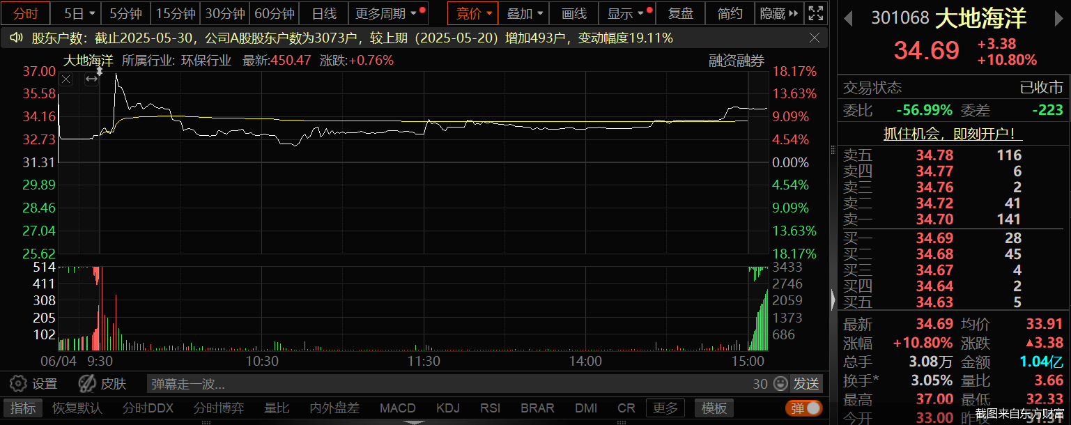 受重组消息影响,6月4日,大地海洋股价迎来一波大涨,盘中一度逼近涨停。截至当日收盘,公司股价收涨10.8%,收于34.69元/股,最新总市值49.02亿元。