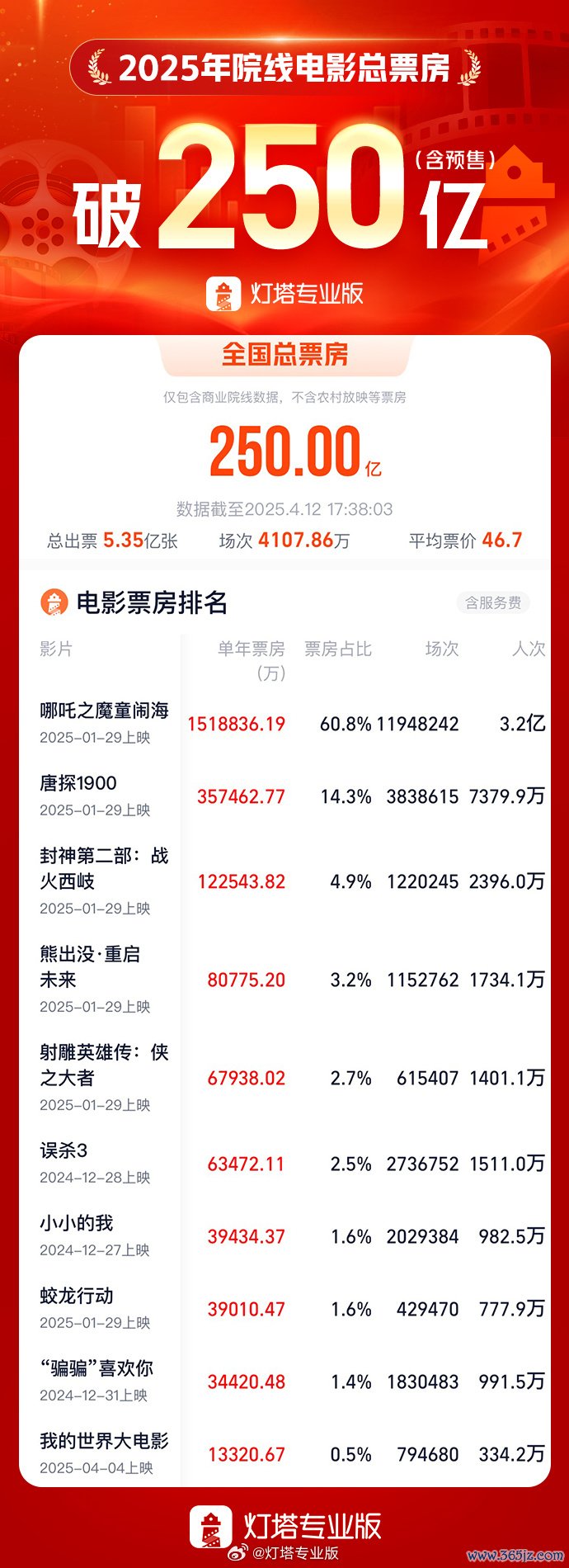 2025年度总票房破250亿 哪吒2票房占年度大盘六成2025年度总票房破250亿 哪吒2票房占年度大盘六成